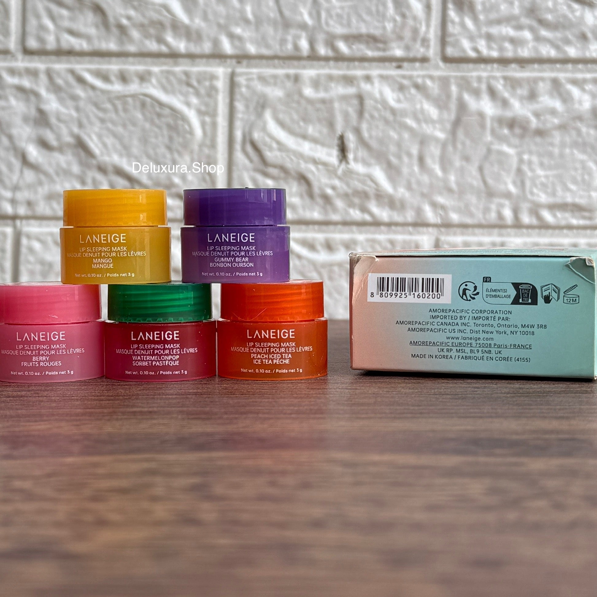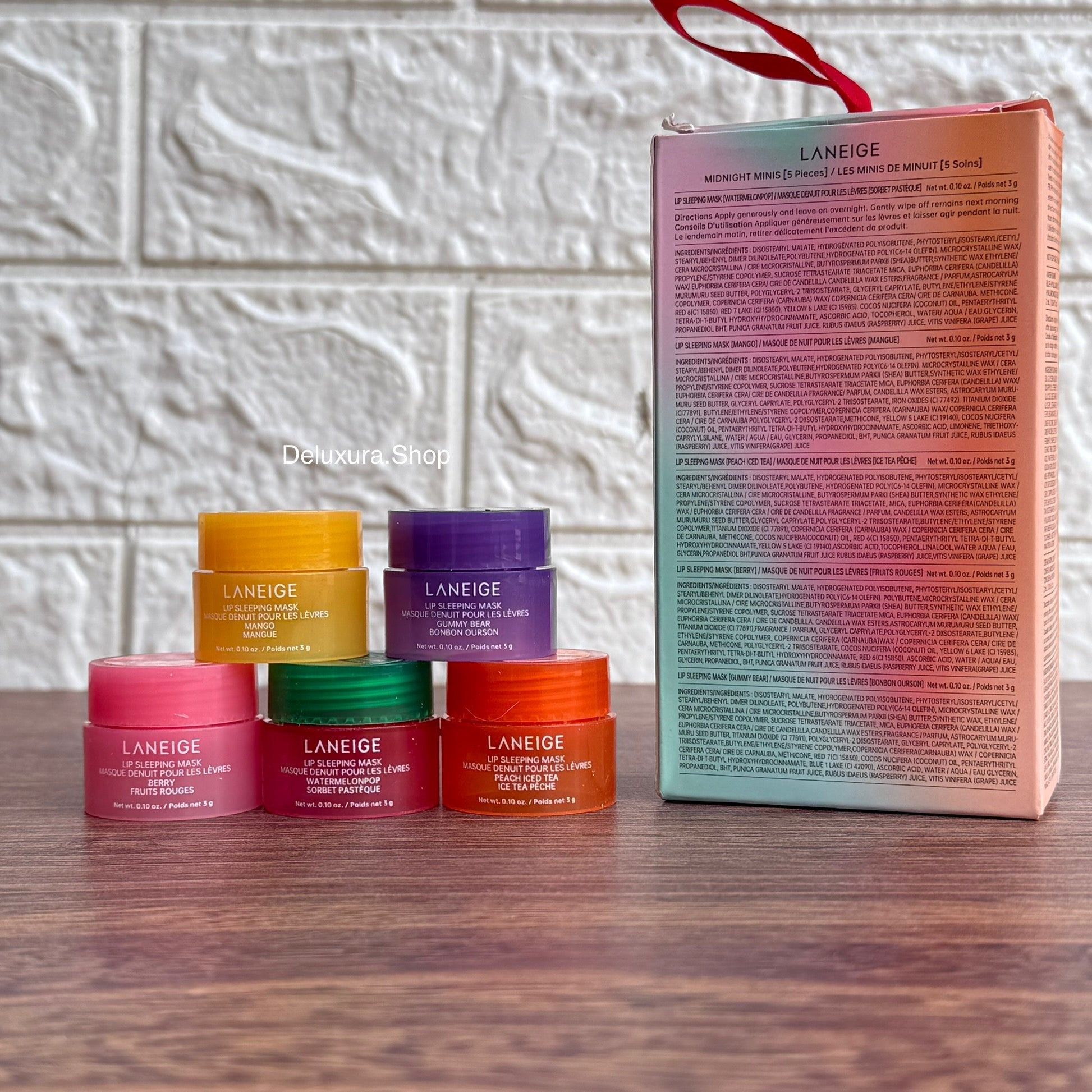 LANEIGE Midnight Minis Set 5 Travel-Size Lip Sleeping Masks100 percent originalWhats InsideWatermelon Pop (3g) fruity, fun, and super refreshingMango (3g) a tropical escape for your lipsPeach Iced Tea (3g) sweet, summery, and brand newBerry (3g) the iconic original youll always come back toGummy Bear (3g) playful, sweet, and irresistibly funMini size, major care wake up to softer, smoother lips every morning!LANEIGE Midnight Minis Set 5 Travel-Size Lip Sleeping Masks 100 percent original Whats Inside Watermelon Pop (3g) fruity, fun, and super refreshing Mango (3g) a tropical escape for your lips Peach Iced Tea (3g) sweet, summery, and brand new Berry (3g) the iconic original youll always come back to Gummy BeaLANEIGE Midnight Minis Set 5 Travel-Size Lip Sleeping Masks 100 percent original Whats Inside Watermelon Pop (3g) fruity, fun, and super refreshing Mango (3g) a tropical escape for your lips Peach Iced Tea (3g) sweet, summery, and brand new Berry (3g) the iconic original youll always come back to Gummy Bea
